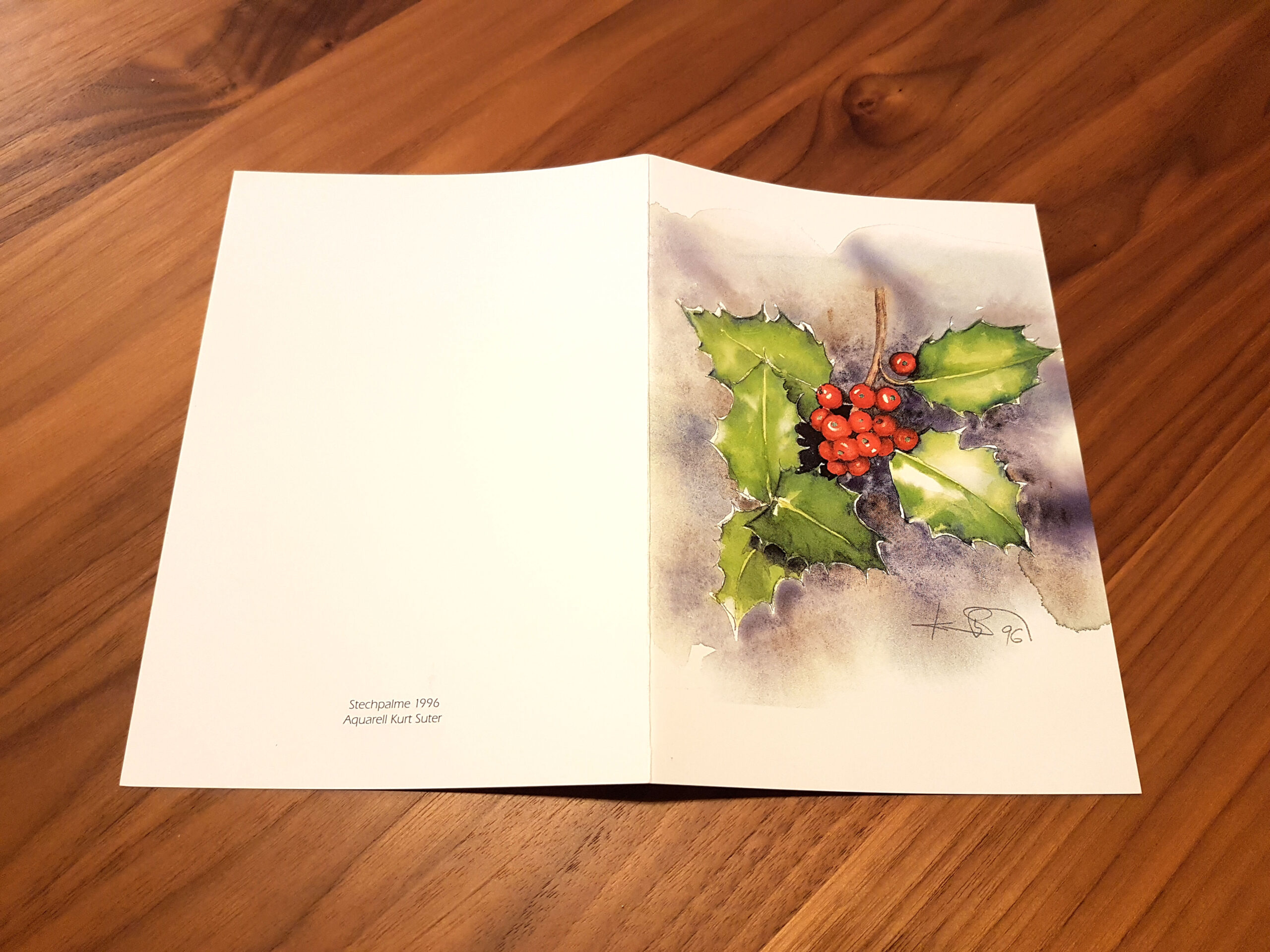 Bei den Kelten und Germanen verbindet man die roten Beeren der Stechpalme mit Hoffnung und Liebe. Die Karte eignet sich besonders als Weihnachtskarte.